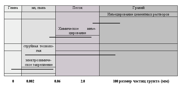 Рис.1 Пределы применения инъекционных геотехнологий.