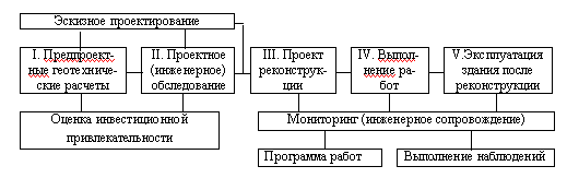 Анализируя отечественный опыт сложной реконструкции, а также аналогичный интернациональный опыт, можно следующим образом обобщить проблему реконструкции и нового строительства в условиях городской застройки. Успешная реализация Проекта реконструкции с учетом всех требований по надежности самого объекта и окружающих его строений во многом зависит от конкретных исходных условий, в первую очередь, от особенностей геотехнической ситуации. Статистика свидетельствует, что до 80% всех аварий зданий при реконструкции городов связаны с недоучетом свойств грунтов. Это и применение в расчетах характеристик грунтов из таблиц СНиП вместо полноценных изысканий. Это и использование данных изысканий на соседних площадках без должного геотехнического осмысления. Такая экономия бессмысленна и финал ее, как правило, очевиден для специалиста-профессионала.Возможные потери очень трудно оценить, если вести работы на всех этапах реконструкции исключительно по существующим нормам (СНиПам). Надо считаться с тем обстоятельством, что нормы создавались для нового строительства, когда речи не шло о массовой реконструкции, тем более за счет инвесторов.Как же поступить инвестору, чтобы неучтенные Проектом расходы не превысили его на каком-то из этапов реализации Проекта к потерям, а порой к провалу самой идеи Проекта - достижению прибыли.Ведь возможные затраты на работы нулевого цикла не выражены явно, как это имеет место при проектировании надземных конструкций. Здесь затраты зависят от многочисленных факторов, которые почти не возможно учесть, заранее пользуясь традиционными приемами оценки инвестиционной привлекательности проекта. Имеющиеся наработки в этом направлении, столь важные для реальной экономии средств инвестора и подрядчика, подробно изложены в этом же разделе журнала в статье А.Г.Шашкина.Объемы работ по проектированию реконструкции и по реализации проекта , конечно, в первую очередь, зависят от сложности реконструкционной ситуации, степени изученности ситуации, а также от квалификации исполнителей. Европейские нормативы (ЕВРОКОДЫ) разделяют объекты по их геотехнической сложности на три категории. Подобную идею реализуют и Московские городские нормы, а также разработанные в СПбГАСУ для Администрации Петербурга "Рекомендации по геотехническому сопровождению нового строительства и реконструкции в условиях городской застройки".В любом случае последовательность разработки и реализации Проекта по основным его пяти этапам может выглядеть следующим образом.