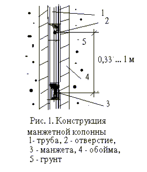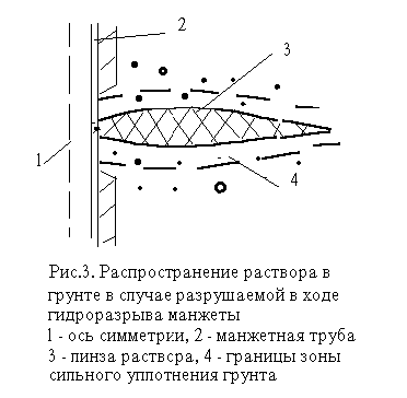 Таким образом, конструкция манжетной колонны для целей укрепительной инъекции оснований зданий и сооружений может быть упрощена по сравнению с существующими аналогами. Эти упрощения касаются, в основном, конструкции манжеты, которая должна разрушаться с началом подачи давлений в грунт. Помимо простоты устройства, присутствие разрушаемой манжеты будет обеспечивать максимальное раскрытие трещин в плоскости разрыва, что будет способствовать их заполнению достаточно грубыми цементными растворами. С другой стороны, при большем раскрытии заполняемых раствором трещин вокруг последних будут увеличиваться размеры зон уплотняемого грунта.