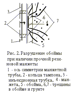 При использовании для целей укрепительной инъекции метода манжетной технологии (ММТ) спектр закрепляемых грунтов практически неограничен. Эта технология выгодно отличается от традиционного способа инъекции нисходящими зонами, когда последовательно заливают раствором скважины и разбуривают их после схватывания с уменьшением диаметра. В этом случае цементный столб выше зоны инъекции играет роль тампона [ 1 ], в то время как при использовании ММТ применяется переносной двойной тампон, перемещаемый в трубах с манжетами. Однако при закреплении связных грунтов, как было показано в [ 2 ], необходим учет ряда обстоятельств, отражающих специфику их разрушения при действии локальных инъекционных давлений. В противном случае инъекция может вызвать ухудшение физико-механических характеристик основания по сравнению с первоначальными.