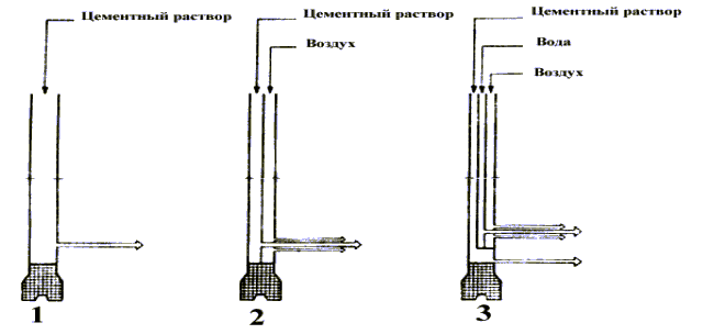трехкомпонентная схема, заключающаяся в размыве грунта струей воды под защитой струи воздуха, и заполнение размытой полости твердеющим цементно-песчаным раствором.