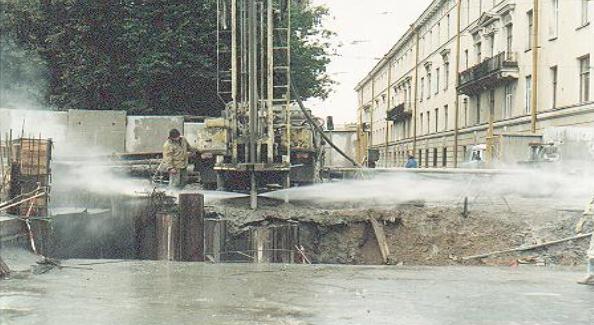 Рис. 2. Реализация струйной технологии в Санкт-Петербурге. Устройство противофильтрационной завесы вдоль подземного пространства на пл. Труда.
