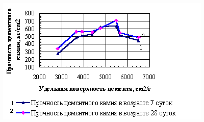 Рис. 3. Зависимость прочности цементного камня от удельной поверхности цемента.