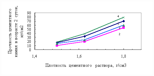 Рис.4. Прочность цементного камня в возрасте 2-х суток. 1-цементный раствор без добавок; 2-цементный раствор с добавкой Na2SiO3; 3-цементный раствор с комплексной добавкой Na2SiO3+С3; 4-цементный раствор с добавкой CaCl2. |
