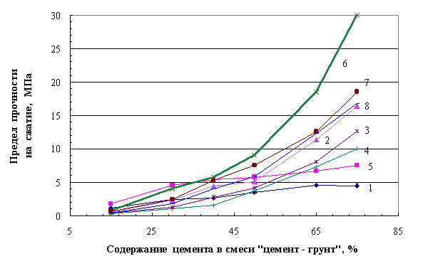 Прочность цементогрунтового материала в возрасте 28 суток, равная 10 МПа, может быть достигнута при содержании цемента (для суглинистого грунта) в количестве не менее 50-55 % и начальном содержании воды в твердеющей смеси в количестве не более 50 %.