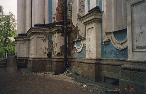 При обследовании цокольной части здания собора, проведенной НПФ “Геореконструкция” в июле 2000 г., было установлено, что в наибольшей степени замачиванию подвержены северная и восточная стороны собора (фото 2). Среди основных причин этого явления могут быть названы: