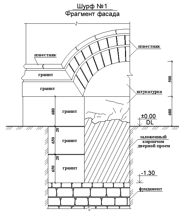 3. Исторически по периметру здания собора были выполнены окна и двери в подвальные помещения. Поскольку культурный слой вокруг собора за период его эксплуатации поднялся к настоящему времени на 1,2 м …1,3 м, окна в подвальные помещения здания оказались ниже планировочной отметки. В результате этого, (а также приспособления подвала собора в убежище в период Великой Отечественной войны) все окна в подвал были заделаны, в основном красным кирпичом с оштукатуренной наружной поверхностью (рис. 1).