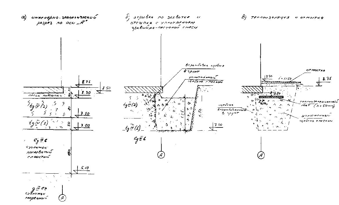 2. Частичная выборка техногенного слоя неслежавшегося суглинка и строительного мусора из под подошвы фундаментной плиты по оси “А” и пересадка ее на трамбованные щебеночные столбы, доведенные до естественного грунта ( рис. 3 ).