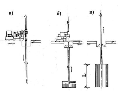 Рис. 1 Технологическая последовательность устройства свай по однокомпонентной технологии а) бурение лидерной скважины; б) размыв грунта раствором; в) извлечение монитора из готовой скважины