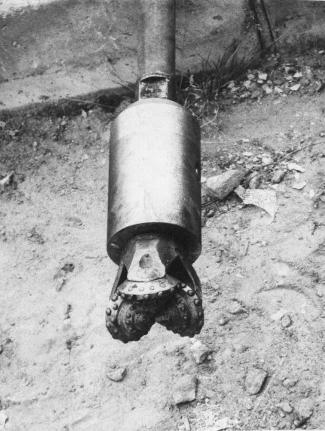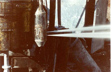 Для реализации струйной технологии был изготовлен монитор с расположенным в нижней части шарошечным долотом, позволяющим бурить лидерные скважины (фото№1). Однокомпонентный монитор применялся для опытных работ по устройству свай в п. Ольгино. Выявленные при откопке шейки ствола были обусловлены недостатками технологии: для размыва применялись короткие буровые трубы длиной 1м, что требовало при выполнении подъемной операции останавливать процесс размыва ствола. Размыв песчаного грунта производился цементным молоком с рабочим давлением до 4МПа.