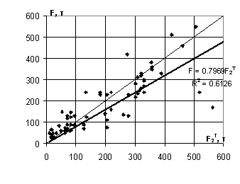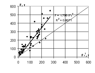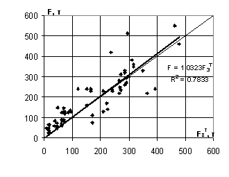 Следующая оценка выполнена для несущей способности F3T, вычисленной в соответствии с гипотезой 3 (рис. 3). При этом коэффициенты формы фундамента принимались равными единице, в противном случае расчетная несущая способность оказывается существенно выше фактической. Такая методика расчета дала завышенный прогноз несущей способности в 25% случаев, однако существенная разница между расчетными и фактическими значениями имеется лишь в 5 случаях, т.е. в 7% рассмотренных случаев. Среднеквадратическое отклонение результатов расчета от фактического значения составляет 56 т. Корреляционная прямая практически совпадает с теоретической (k =1,032 при коэффициенте корреляции R=0,86).