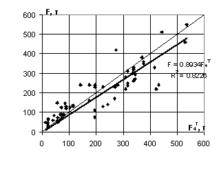 Прогноз несущей способности буровых свай без введения понижающих коэффициентов для расчетного сопротивления грунта по боковой поверхности F4T (гипотеза 4) показал завышение по сравнению с фактической несущей способностью в 47% случаев (рис. 4). Фактическая несущая способность, в среднем, оказывается на 11% ниже рассчитанной на основании гипотезы 4 (k =0,893, коэффициент корреляции R=0,91) при среднеквадратическом отклонении 55 т от теоретической прямой.