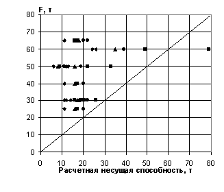 Рис. 1. Диаграмма соответствия рассчитанной несущей способности свай по гипотезе 1 и несущей способности, определенной на основании результатов статических испытаний